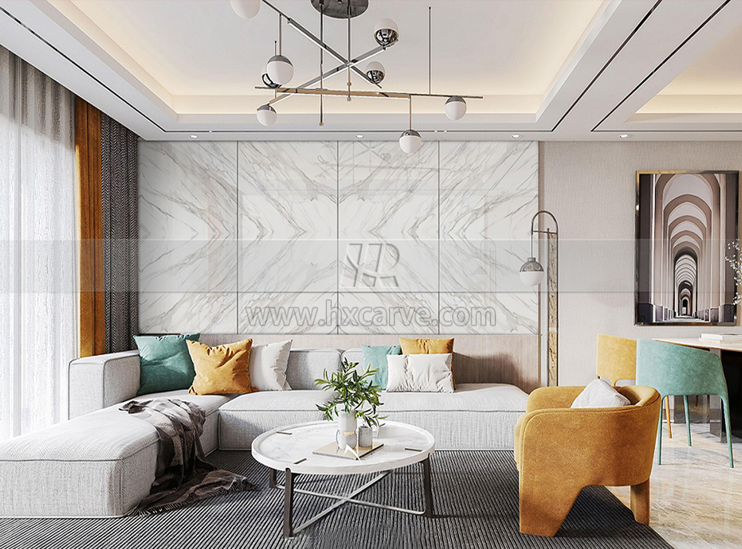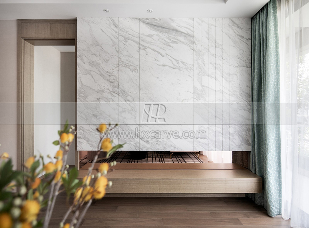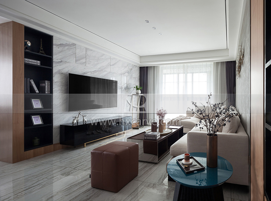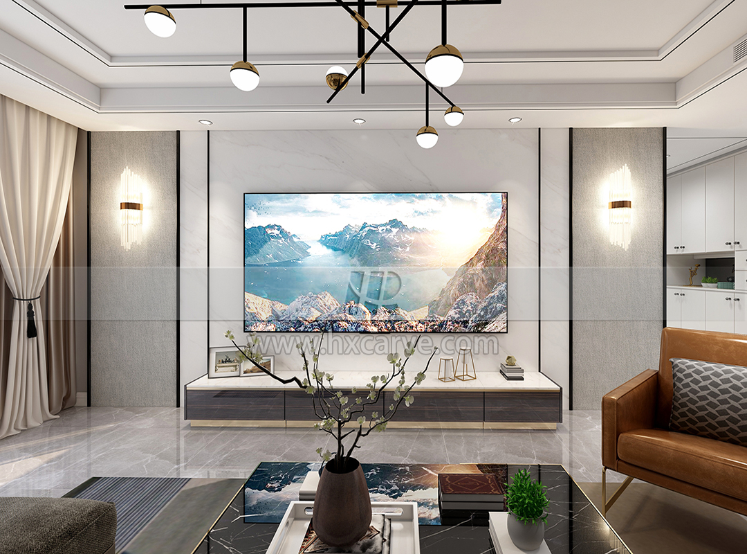 現代簡約石材背景墻,石材電視墻,沙發背景墻,餐廳背景墻,是家庭硬裝裝修中比較關注的部位。現如今石材背景墻的設計風格趨于簡約化,甚至有些設計師更愿意體現天然大理石的自然紋理。簡單的切割,利用天然紋理,拼出一幅幅獨特的圖案。一些錯落的拼貼、石材斜拼、簡單的石材線條、結合壁紙壁布、軟包,使背景墻的裝飾風格自然、大氣。